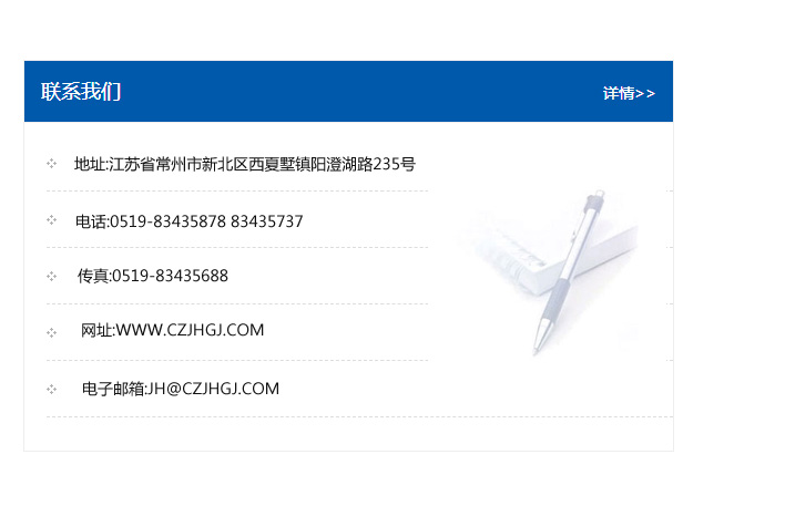 地址:常州市新北區友邦商務大廈1幢16、17層  電話:0519-85101652  傳真:0519-85112595  郵編:213022  網址:www.cz-jiayue_cn.ouzhouxinan.com  郵箱:xiajifengaa@163.com